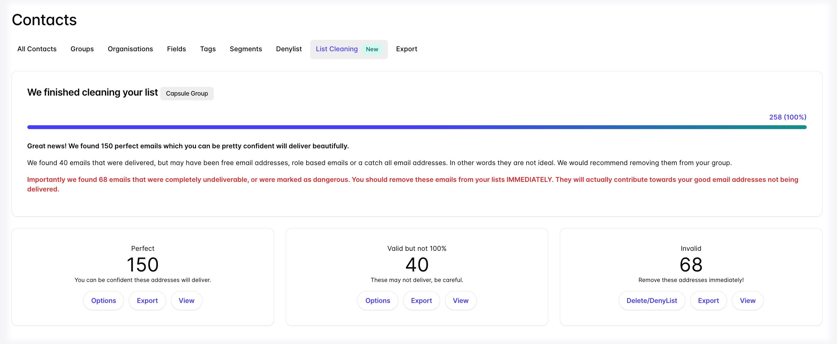 Once the list cleaning process has finished, you can review the results and take action to remove any invalid email addresses.