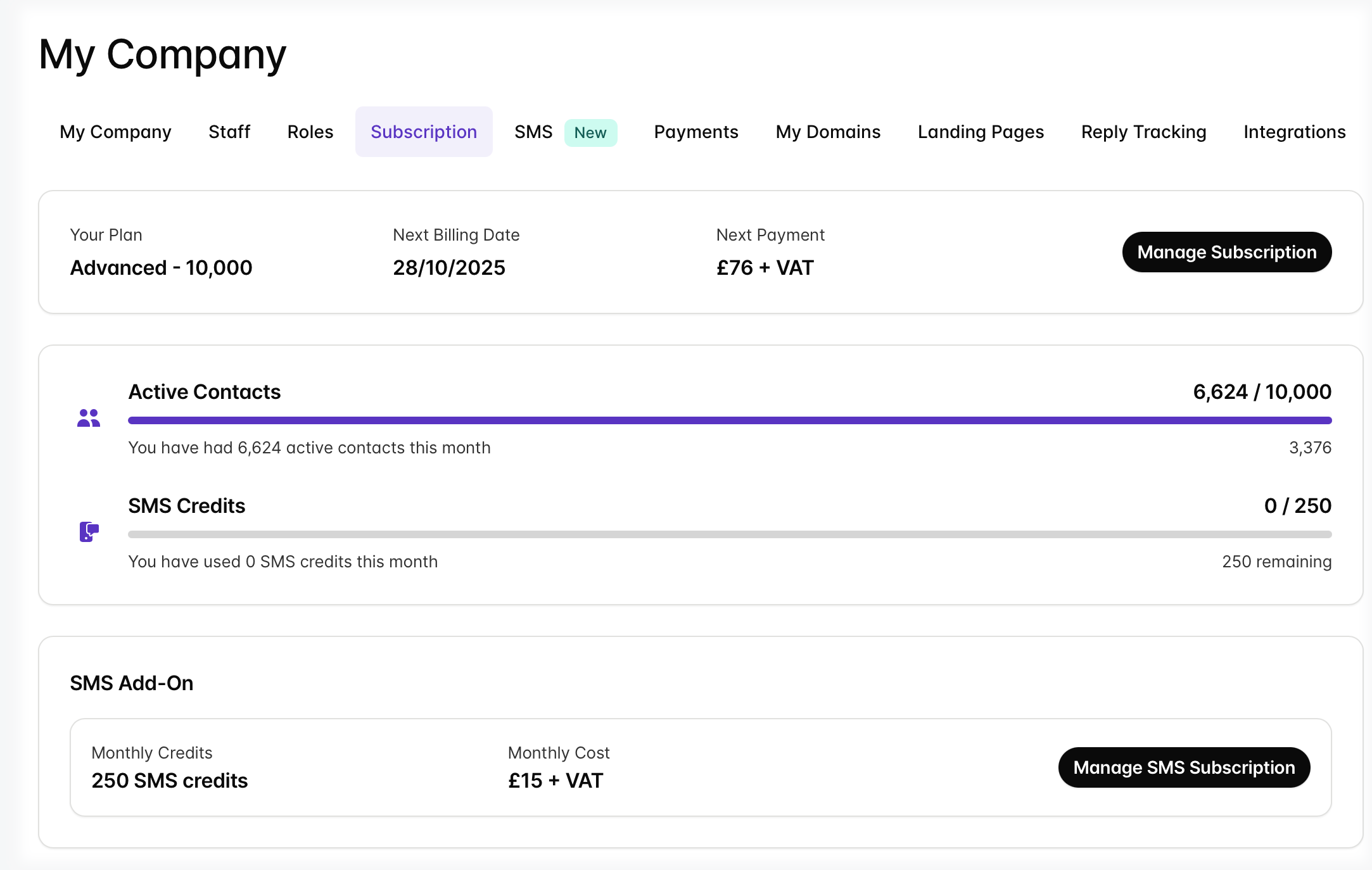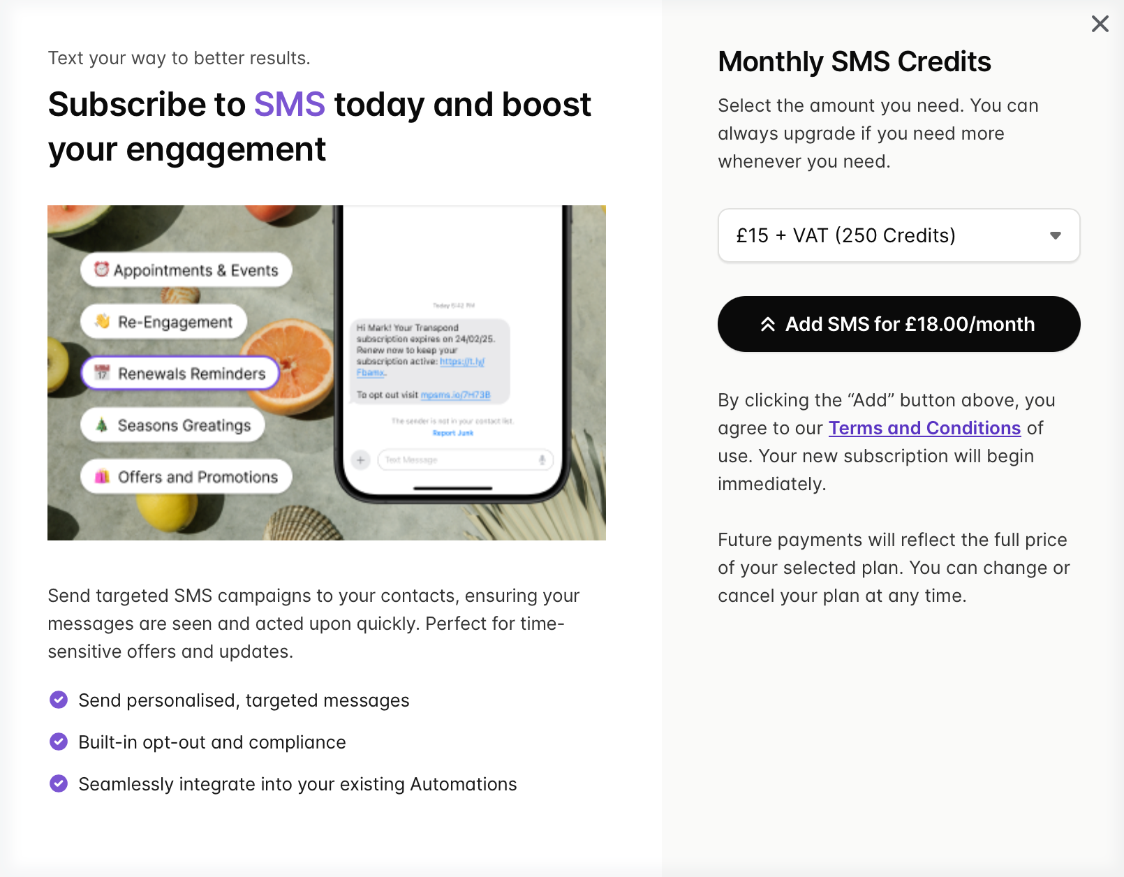 When you create your first SMS campaign you’ll be prompted to add an SMS bundle before you send the campaign. Choose which bundle you want to use and confirm using the button that says Add SMS for £xx/month.
