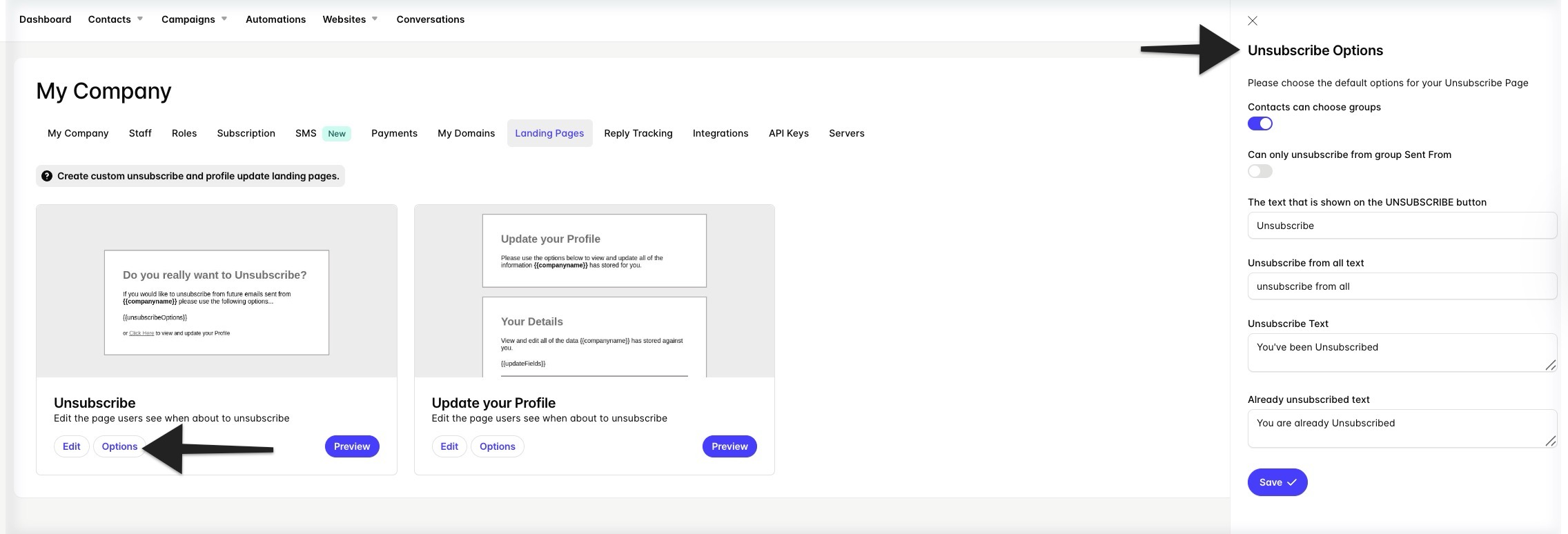 There are a number of defaults you can set for each Landing Page to customise the experience for your Contacts. To do this, use the Options button under each page.